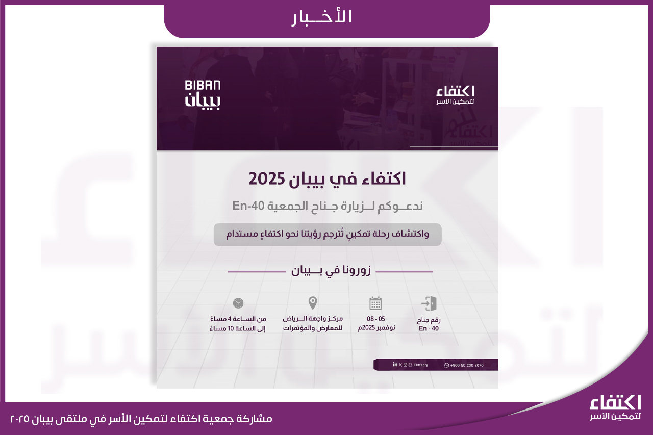 حظي ملتقى اكتفاء لريادة الأعمال بتشريف صاحب السمو الملكي الأمير عبدالعزيز بن خالد بن ثامر آل سعود، الذي اطلع خلال زيارته على أبرز إنجازات المستفيدين من مبادرة مشروعي واستمع إلى عروض مشاريعهم التي تعكس روح الابتكار والطموح لديهم ويأتي الملتقى تأكيدًا لرؤية جمعية اكتفاء لتمكين الأسر في تعزيز فرص التمكين الاقتصادي، ودعم رواد ورائدات الأعمال لبناء مستقبل مزدهر يواكب تطلعات الوطن.