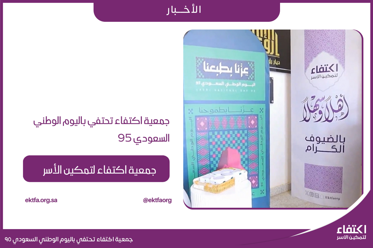 احتفت جمعية اكتفاء لتمكين الأسر باليوم الوطني السعودي 95 في فعالية وطنية عبّرت عن الفخر بالوطن ومسيرة التنمية وشهدت مشاركة إحدى مستفيدات مبادرة مشروعي تجسيدًا للتمكين ودعم المبادرات التنموية وأكدت الجمعية مواصلتها مسيرة التمكين وصناعة الأثر بما يواكب رؤية المملكة 2030.