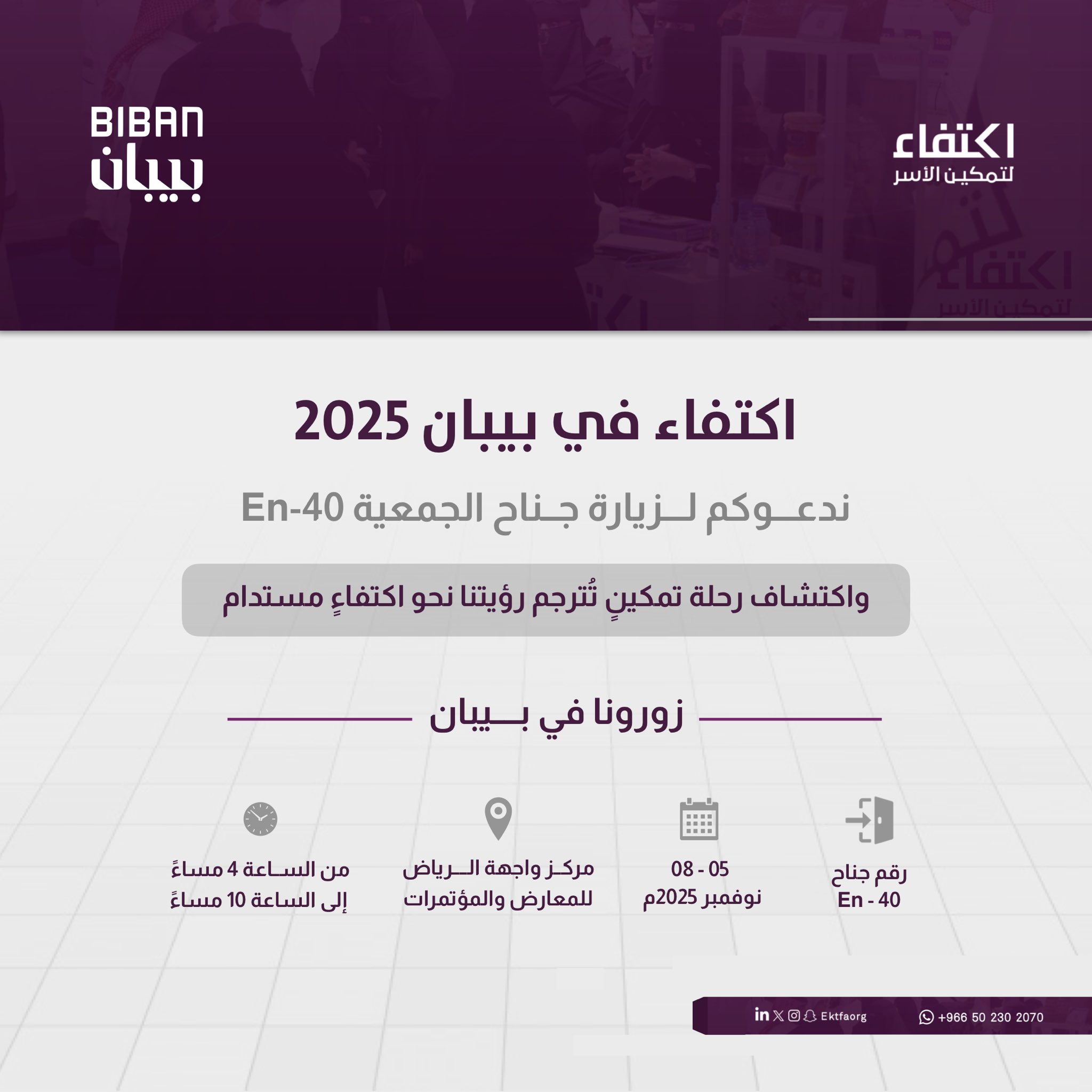 تُعلن جمعية اكتفاء لتمكين الأسر عن مشاركتها في ملتقى بيبان 2025، الذي تنظمه الهيئة العامة للمنشآت الصغيرة والمتوسطة “منشآت” تحت شعار “وجهة عالمية للفرص”، وتهدف الجمعية من خلال هذه المشاركة إلى إبراز جهودها في دعم وتمكين الأسر وبناء شراكات استراتيجية فاعلة، إضافة إلى تبادل الخبرات مع الجهات المشاركة بما يعزز التكامل بين القطاعات المختلفة ويسهم في تحقيق مستهدفات التنمية والتمكين المجتمعي.