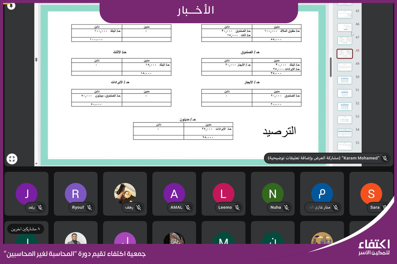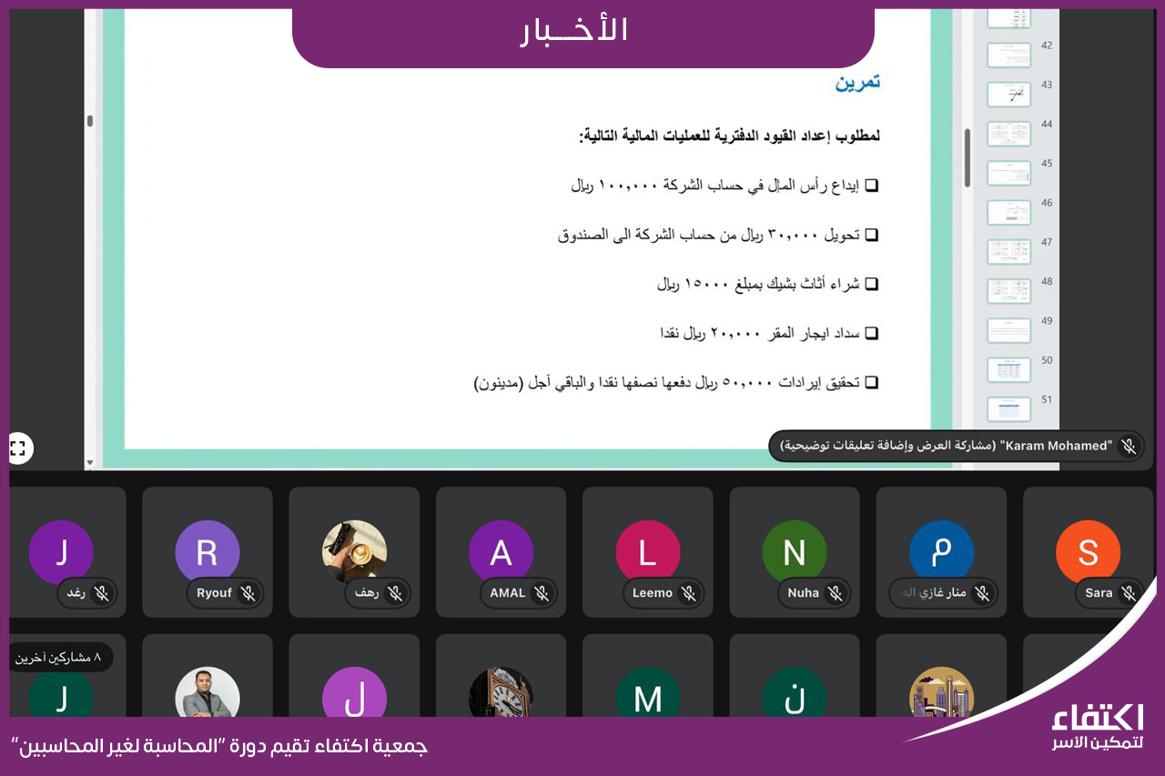 أقامت جمعية اكتفاء لتمكين الأسر دورة بعنوان المحاسبة لغير المحاسبين لخريجي تخصص المحاسبة في قسم المنح الدراسية وذلك بقيادة المدرب الأستاذ كرم محمد وتأتي هذه الدورة ضمن جهود الجمعية في تطوير المهارات العملية وتعزيز الجاهزية المهنية للمستفيدين من خلال برنامج تدريبي مكثّف استمر لمدة ثلاثة أيام أسهم في رفع مستوى تأهيلهم وتمكينهم من دخول سوق العمل بكفاءة عالية ومعرفة مهنية تطبيقية.