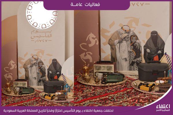 احتفلت جمعية اكتفاء بـ يوم التأسيس اعتزازًا وفخراً لتاريخ المملكة العربية السعودية برعاية إحدى سيدات الأعمال دعمًا لمستفيدي قسم المشاريع