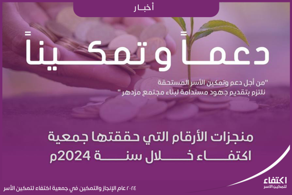 2024 عام الإنجاز والتمكين في جمعية اكتفاء لتمكين الأسر Uncategorized, أرقام وإنجازات, جديدناBy adminمارس 22, 2025Leave a comment2024 عام الإنجاز والتمكين في جمعية اكتفاء لتمكين الأسر